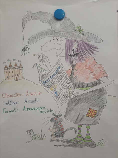 So what you do is select two, three, or any number of characters from the list; one or two settings from the list; and one type of format for your story. Then you put them together and create your story–and use Kathy’s illustrations as fun prompts!